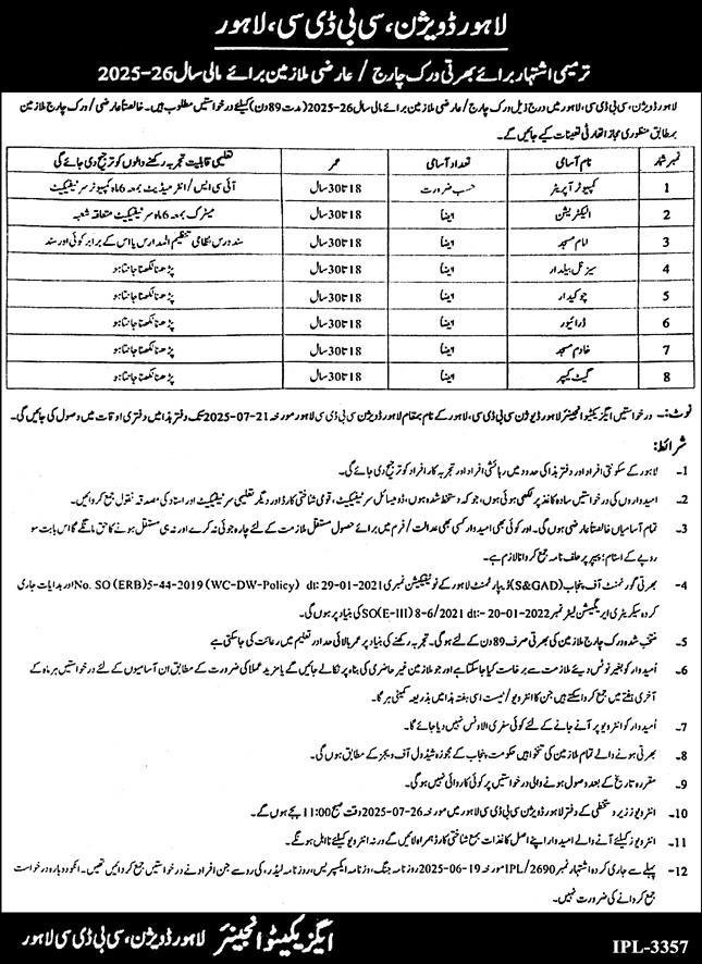 CBDC Lahore Jobs 2025 – Computer Operator, Electrician, Imam, Driver, Chowkidar – Apply Before 21 July