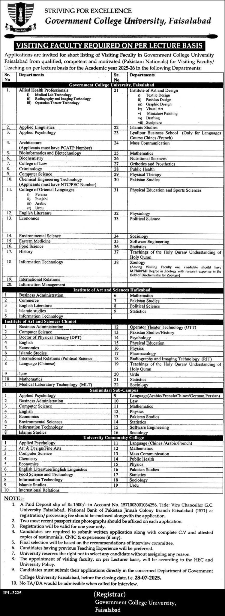 Government College University Faisalabad invites applications for Visiting Faculty (Per Lecture Basis) in 40+ departments. Deadline: 28 July 2025. Apply today!